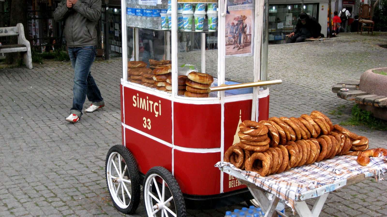 You'll find Simit wagons, like this one, all over Istanbul,  Simit, eaten throughout the Balkans and the Middle East, is a delectable, chewy sesame-seed covered round bread that goes well with mozzarella-like  keshar cheese. One of Istanbul's top five street foods, it's also found in chains like Simit Sarayi (Simit Palace) throughout the city. That's where we called it lunch!